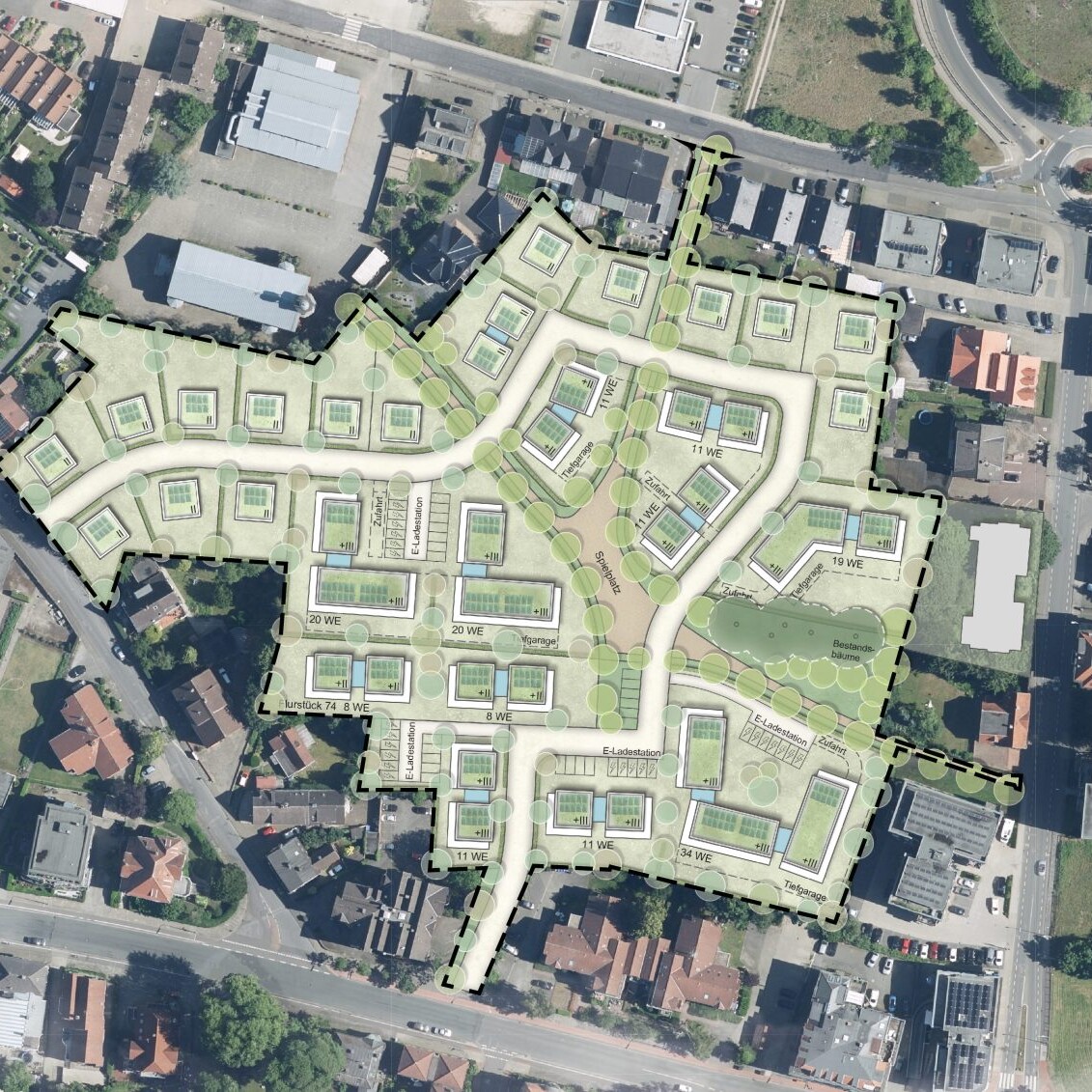 Das in den städtebaulichen Entwurf eingebundene Freiraumkonzept sieht eine markante Grünraumstruktur mit ihrem Zentrum in der Mitte des neu entstehenden Quartiers vor. Ergänzt durch mehrere Wegeflächen durchzieht diese Grünachse das Plangebiet in Nord-Süd- sowie Ost-West-Richtung und schafft dabei eine Durchlässigkeit zur Ems. Prägende Bäume und bestehende Gehölzstrukturen werden integriert. Der bestehende Landschaftsraum der Emsaue soll in Folge der neu entstehenden Wegeverbindung in Teilbereichen eine Aktivierung erfahren und den umliegenden Wohnquartieren als „Grüne Lunge“ wie auch als verbindendes Bindungsglied dienen.