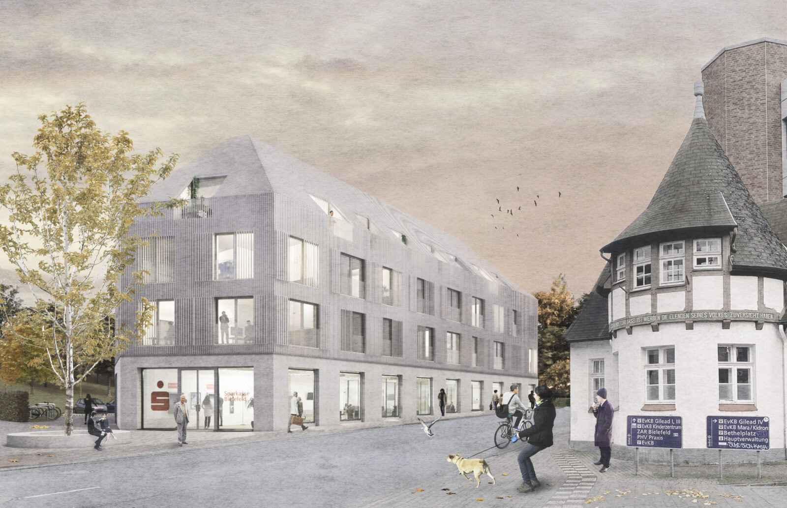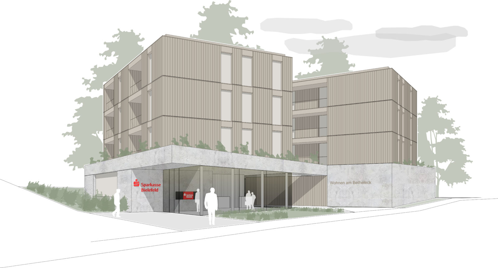 Die Sparkasse Bielefeld beabsichtigt eine städte-bauliche und hochbauliche Neuordnung der heu-tigen Filiale Betheleck (Adresse: Kantensiek 3,33617 Bielefeld). Das bestehende Gebäude ent-spricht nicht mehr den heutigen funktionalen Anforderungen sowie dem zeitgemäßen Gebäude-standard und soll deshalb durch ein neues Ge-bäude ersetzt werden. Die zentrale Lage und die sehr gute ÖPNV-Erschließung trägt wesentlich zur Attraktivität des Standortes bei und erlaubt unter-schiedliche Nutzungsangebote. Auf dem Grund-stück (ca. 1.500 m²) soll eine Kombination von Spar-kassenfiliale Betheleck und weiteren Nutzungen (vorrangig Wohnungen und ergänzende Dienst-leistungen) realisiert werden.